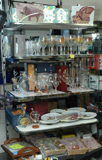 Coffrets de verres différents formats, carafes, pendules, assièttes décoratives, dessous de plats, lampes, plats de services, malettes de couteaux, verres soufflé, plateaux, poivre et sel.